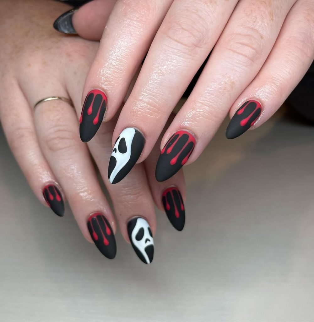 @handoesnails did not come to play. This is full scream queen mode. Black matte nails with dripping red and a bold “Scream” face as the centerpiece? It’s pure slasher chic.