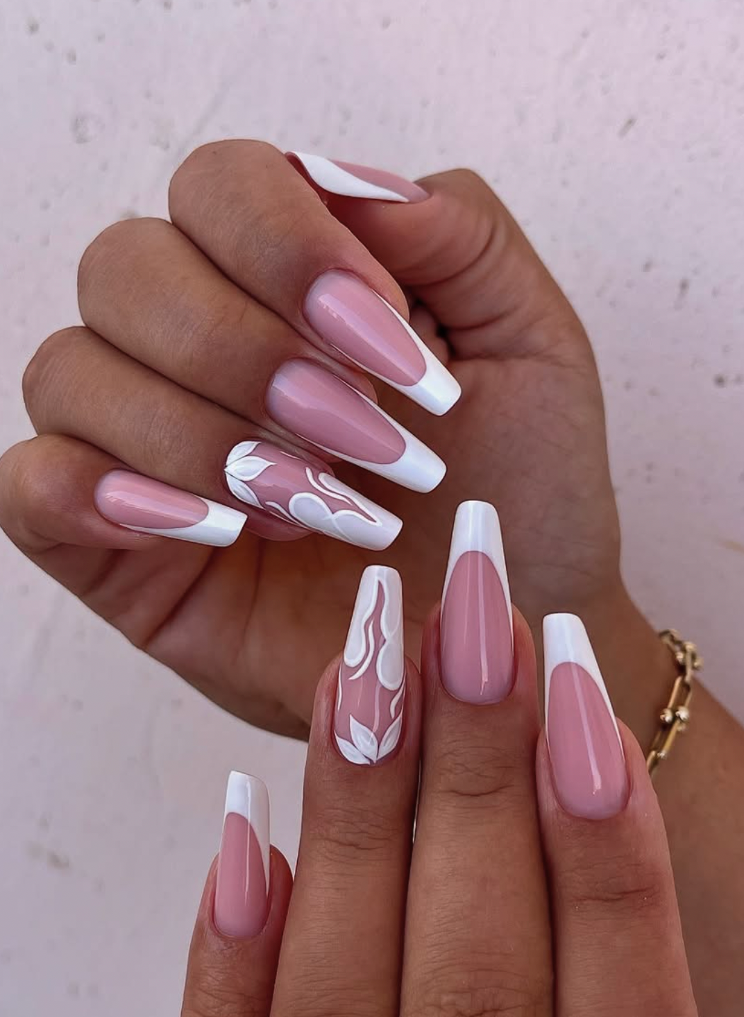 A crisp white tip over a soft pink base—this set is the definition of “I care, but not too much.” It’s simple, polished, and one of those designs that looks good with absolutely everything, from iced-coffee-runs to actual meetings.