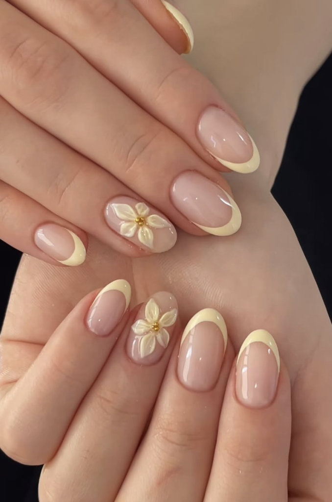Soft buttery yellow tips combined with 3D floral accents—this set is sweet, delicate, and just a touch whimsical. The rounded shape keeps everything feeling soft and wearable.