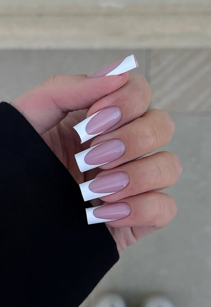 Here’s a softer almond twist on the classic French, and honestly… she’s a beauty. The curve of the white tip feels delicate and naturally flattering, especially if you like your nails elegant rather than loud.