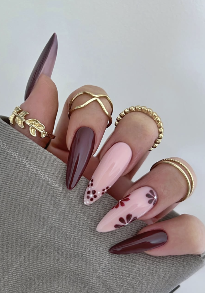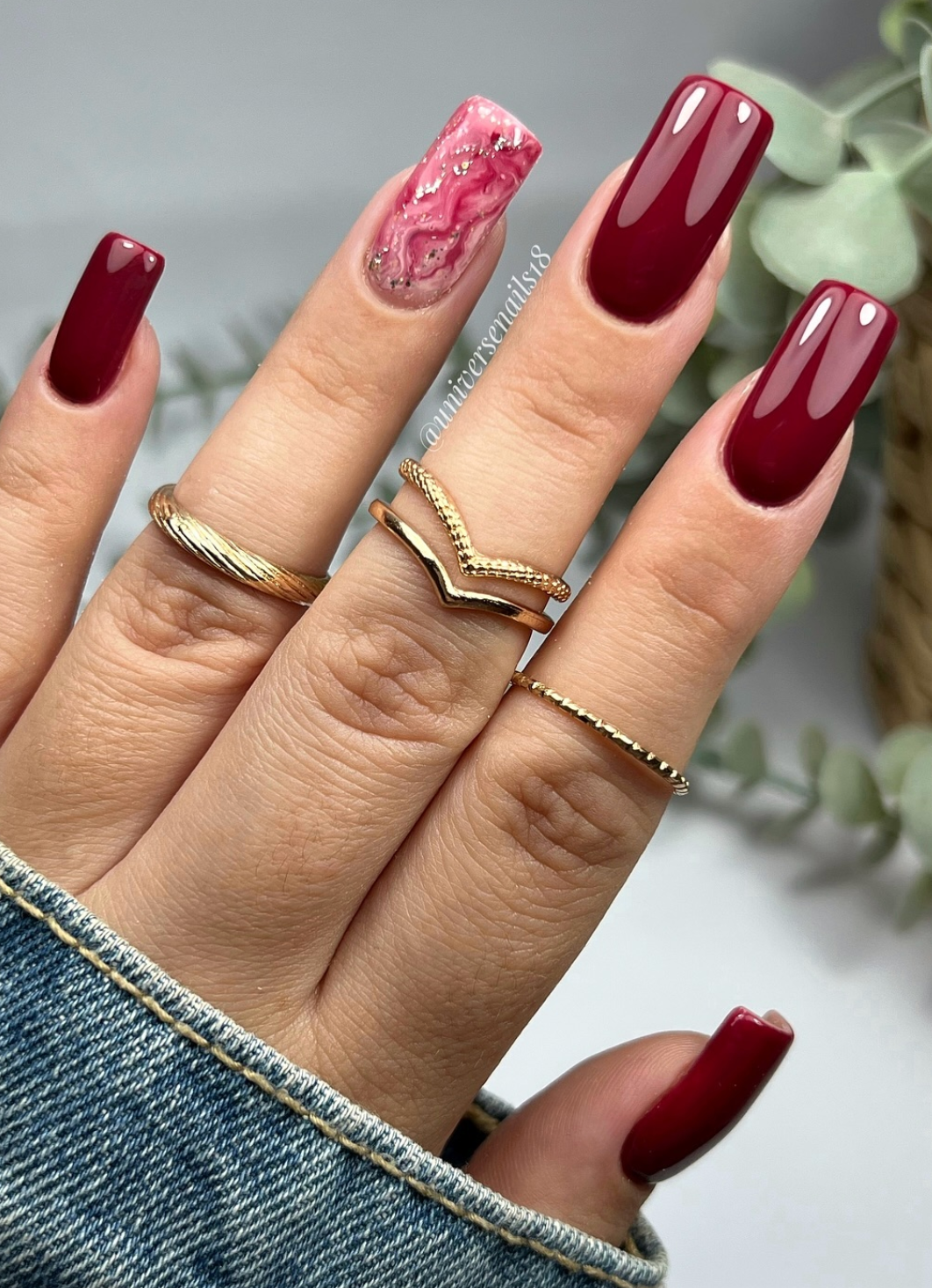 This deep berry red is already a stunner, but that pink marble accent? It’s giving luxe spa vibes. The glossy finish and gold flecks add just the right amount of drama.