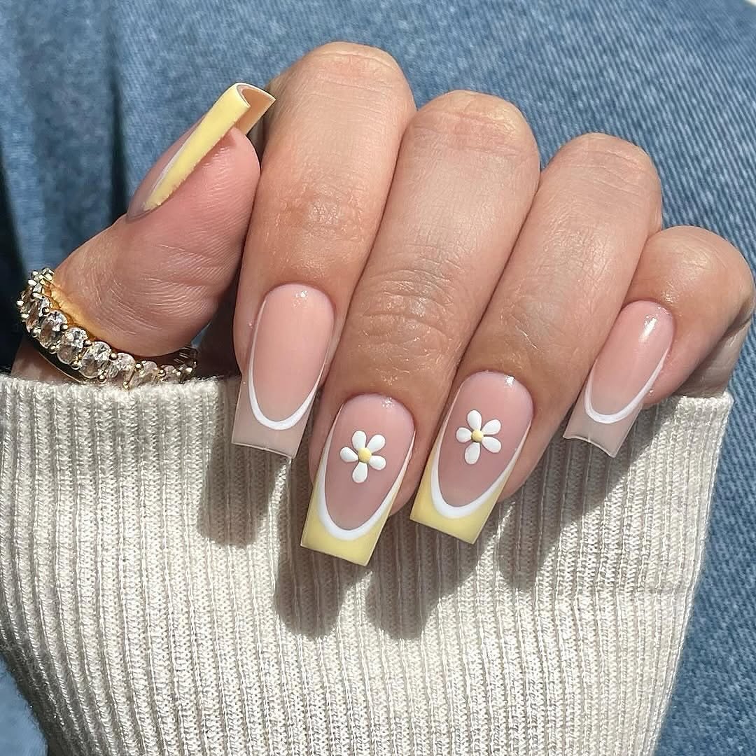 Soft yellow tips paired with daisy accents? It’s like sunshine for your fingertips. The mix of white curves and bright pastel edging feels playful without tipping into cartoonish.