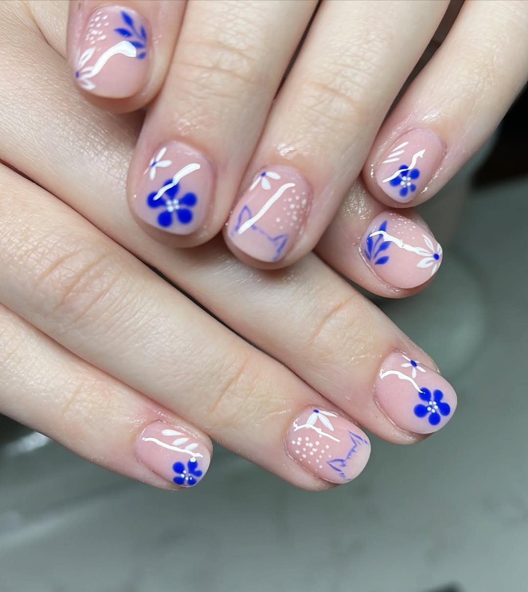 These nails feel like tiny pieces of spring. The soft pink base keeps the manicure looking natural and polished, while the little cobalt-blue flowers and delicate white vine details add just the right amount of charm.