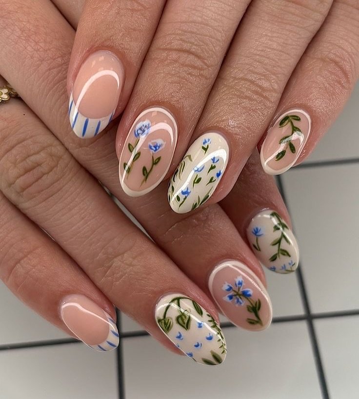 These nails bring a soft nature-inspired vibe while still keeping things simple. The nude base creates a neutral canvas, and the tiny blue flowers and green stems add delicate botanical details.