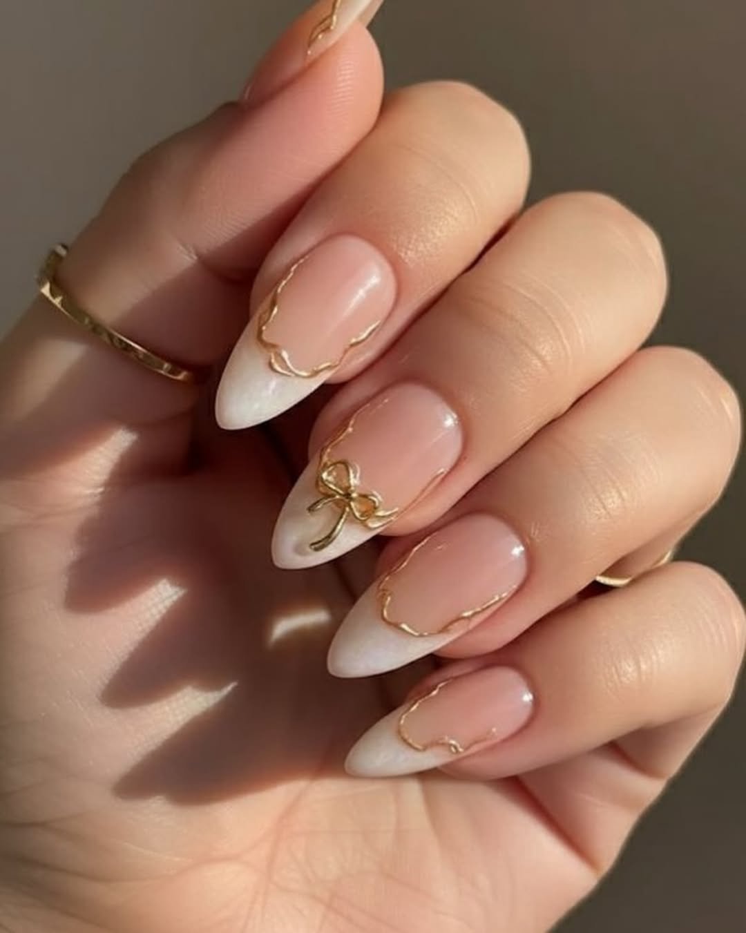 These nails are pure elegance. The soft nude base paired with milky white tips already creates a beautiful, bridal-style foundation, but the delicate gold outlines and tiny bow charm make the set feel extra special.