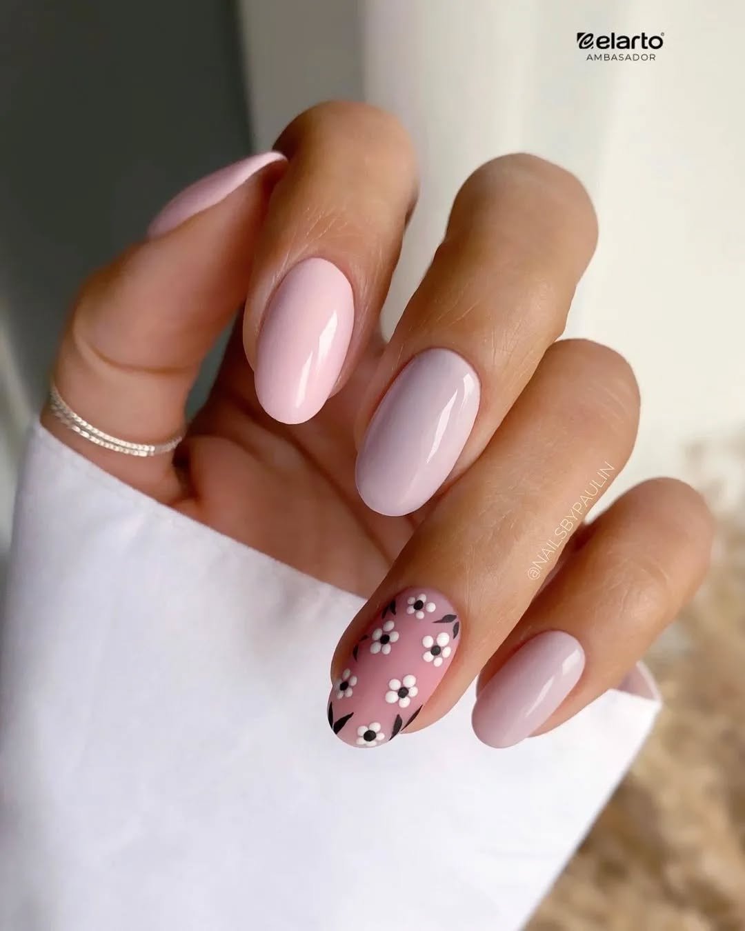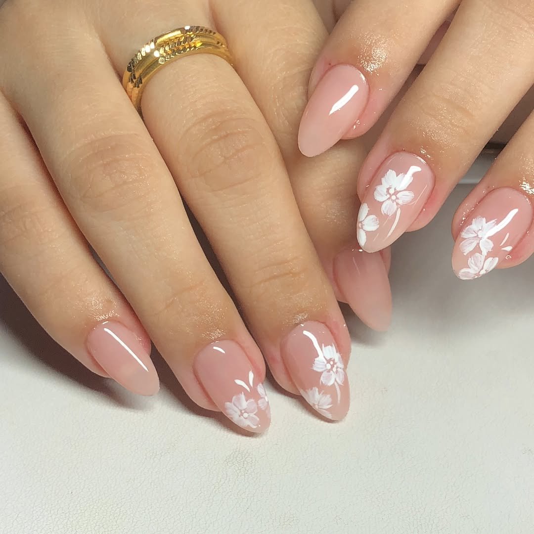Soft pink nails already look effortlessly pretty, but adding tiny white blossoms makes the manicure feel even more delicate. The floral accents are subtle, so the overall look still stays very simple and clean.