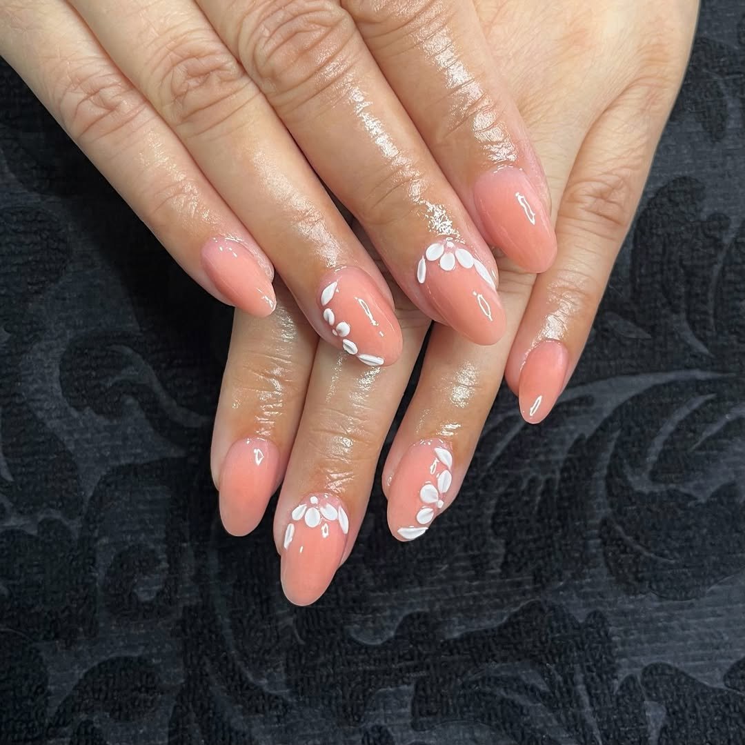 These sheer nude nails with delicate white floral artwork feel incredibly soft and romantic. The transparent base keeps the manicure light, while the detailed flowers add just the right amount of decoration.