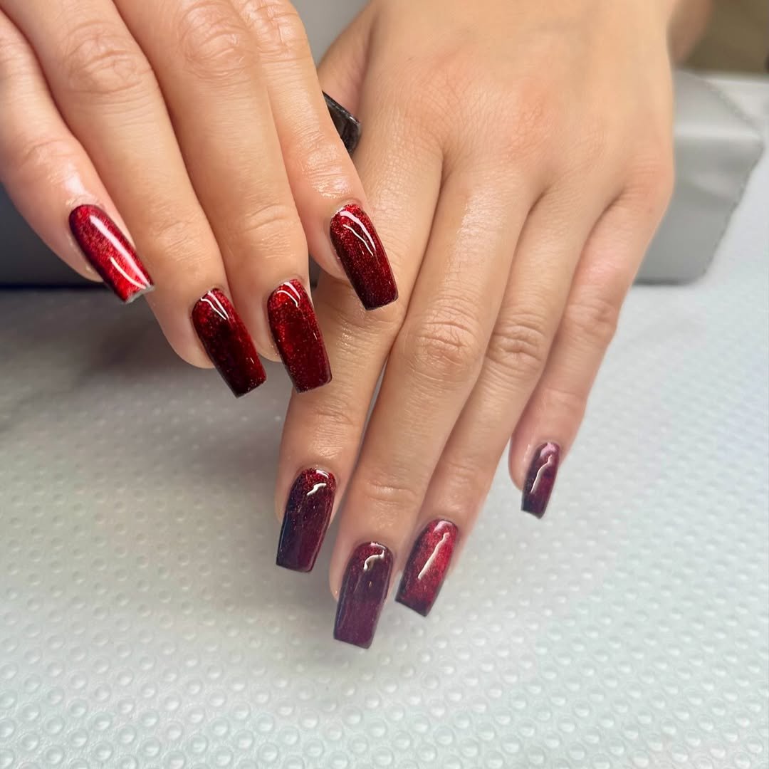 These deep ruby nails instantly grab attention. The metallic shimmer shifts beautifully in the light, creating a rich, almost velvet-like finish that feels bold and luxurious.