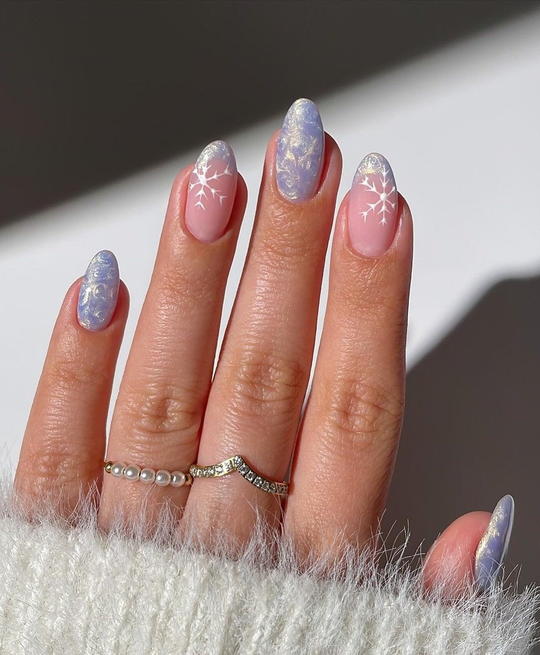 These nails give off the prettiest winter vibe while still keeping things light and simple. The mix of icy blue shimmer and soft pink bases with delicate snowflakes creates a manicure that feels seasonal but still super wearable.
