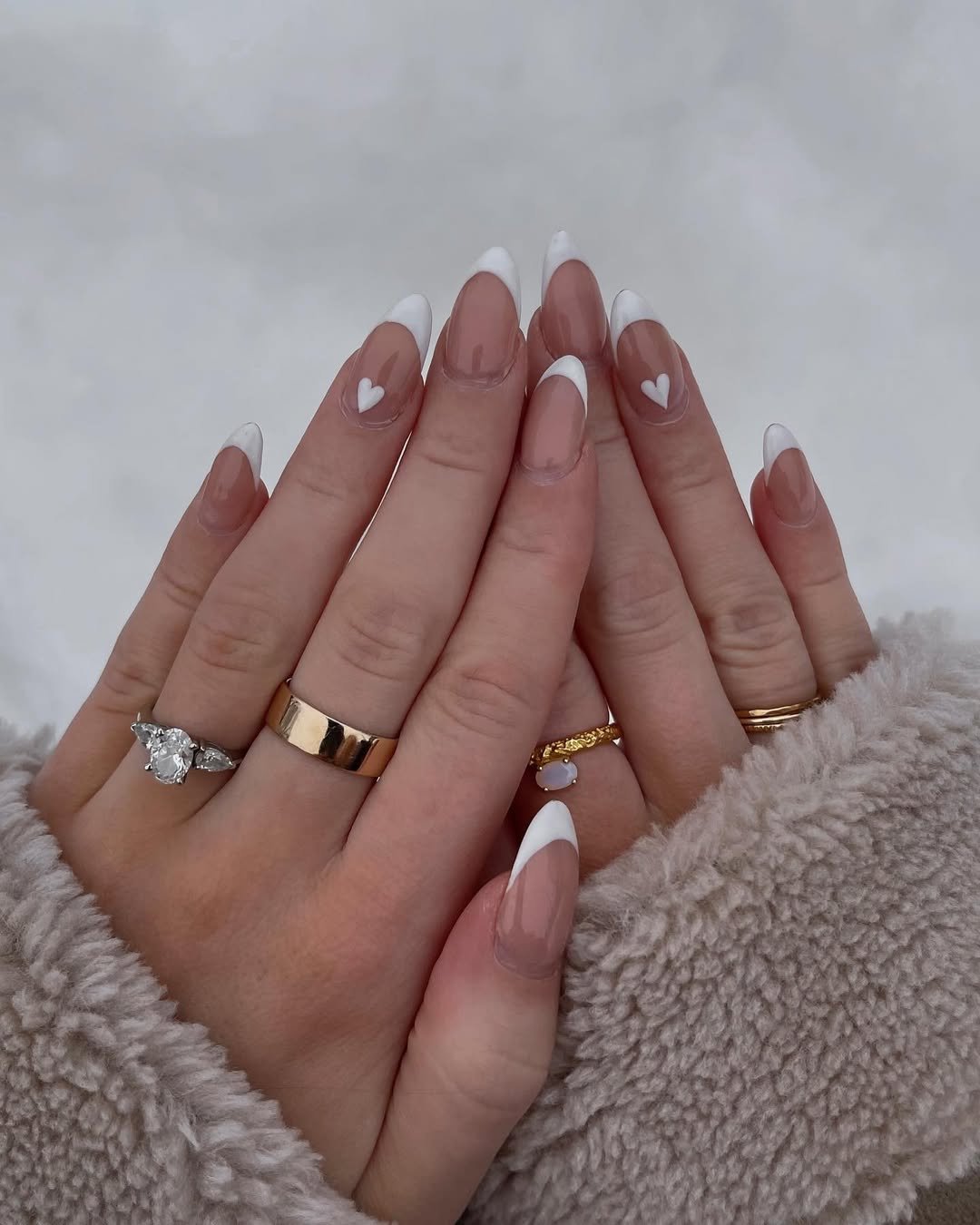 This design takes the classic French manicure and adds the sweetest little detail. The soft nude base paired with sharp white tips already feels elegant, but those tiny heart accents bring a playful charm to the whole look.