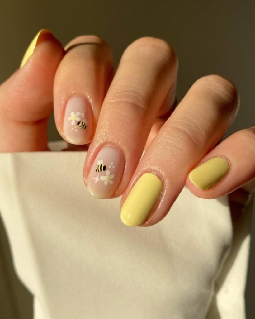 This set is spring in its calmest form. Milky bases, soft yellow accents, and tiny bees that feel more sweet than statement. It’s minimal, but not boring—like a quiet garden moment captured on your nails.