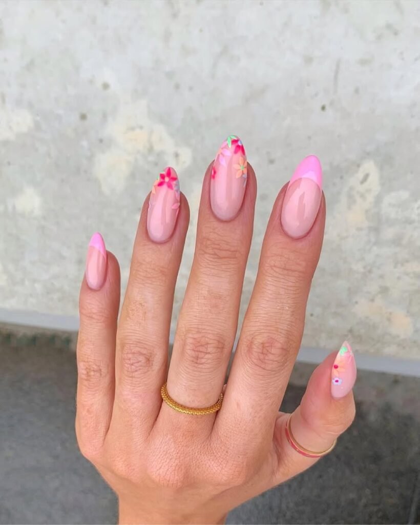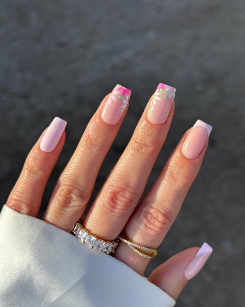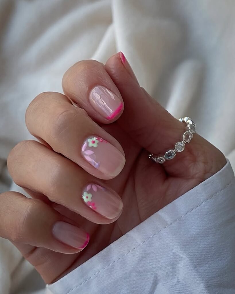 Classic French tips get a spring refresh here with delicate florals and creamy whites. Everything feels airy and intentional, like fresh linen on a sunny morning. Nothing loud—just effortlessly pretty.