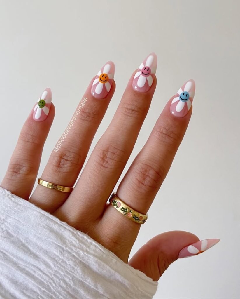These smiley daisies feel like instant serotonin. Soft pink bases keep things simple, while those cheerful faces add just the right amount of personality—playful, but not over-the-top. It’s the kind of manicure that makes you glance at your hands and smile for no reason.