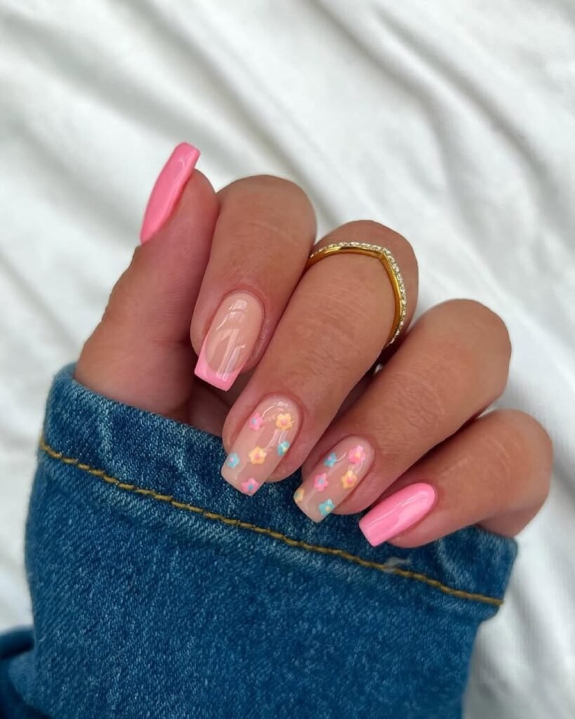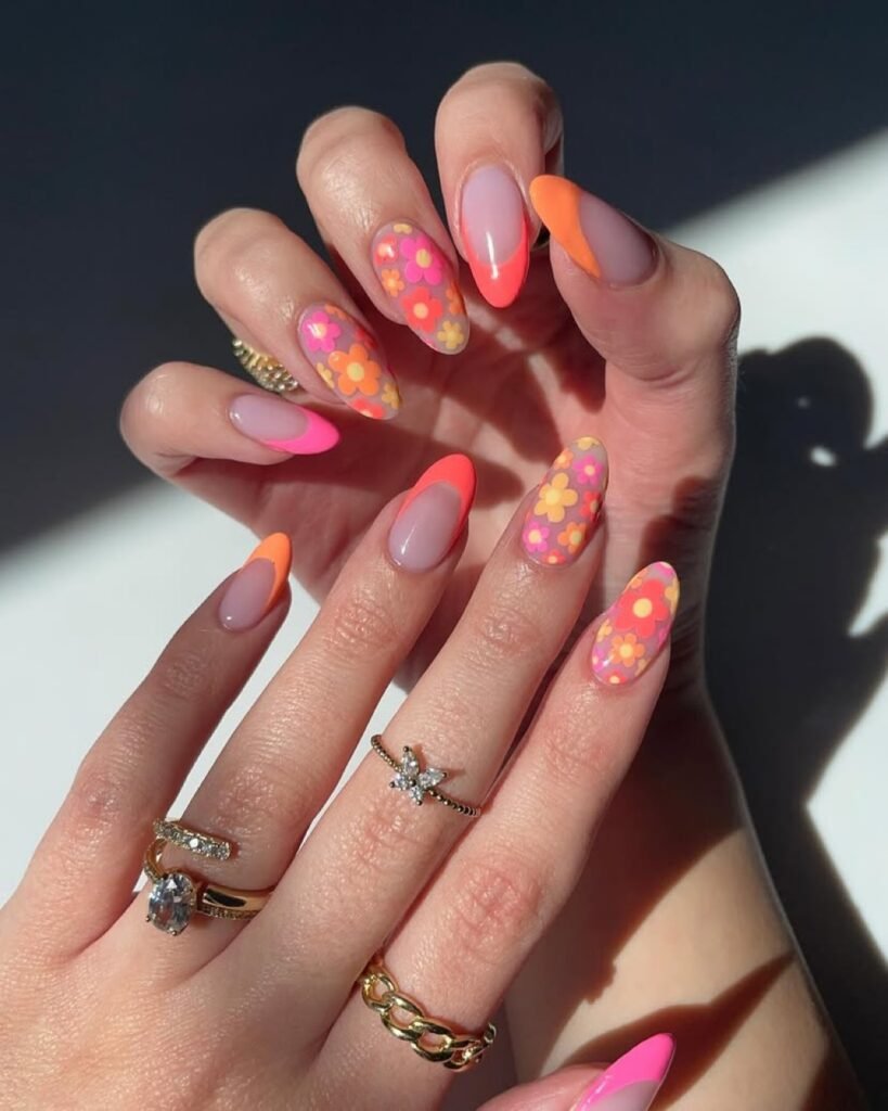 These nails are pure sunshine. Bright florals, playful pops of pink and orange, and that retro energy that makes you smile the second you see them. It’s giving spring picnic meets main-character mood.