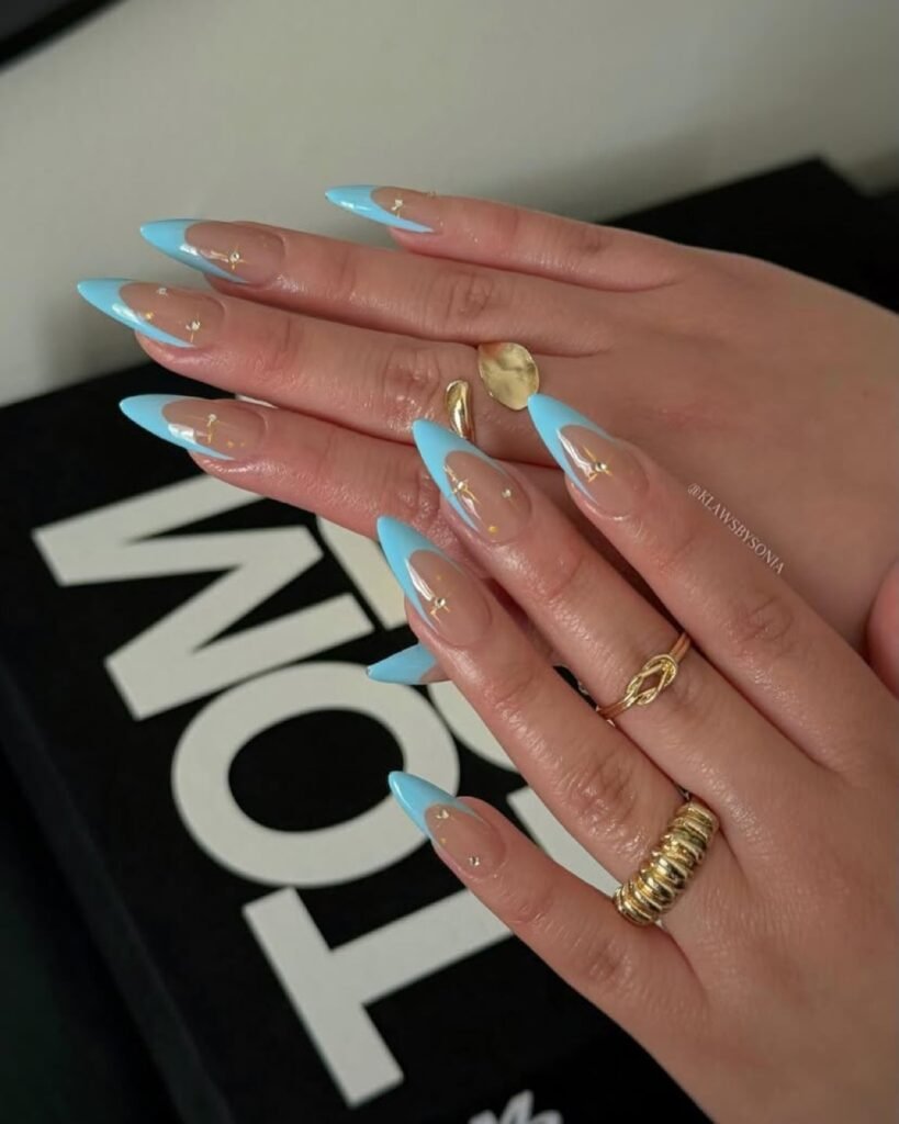 There’s something instantly calming about this baby-blue French. It feels fresh without trying too hard, like spring air through an open window. The subtle gold accents catch the light just enough to keep things interesting but never overpower the look.