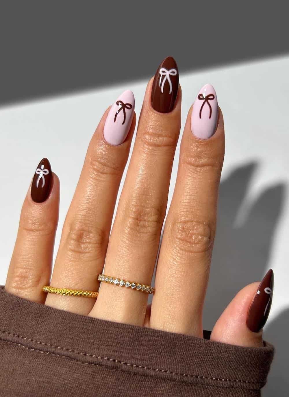 These chocolate-and-cream nails with tiny white bows are giving sweet-meets-sophisticated energy. They’re playful without being over the top, and the contrast between the deep brown and pale pink is perfectly festive.
