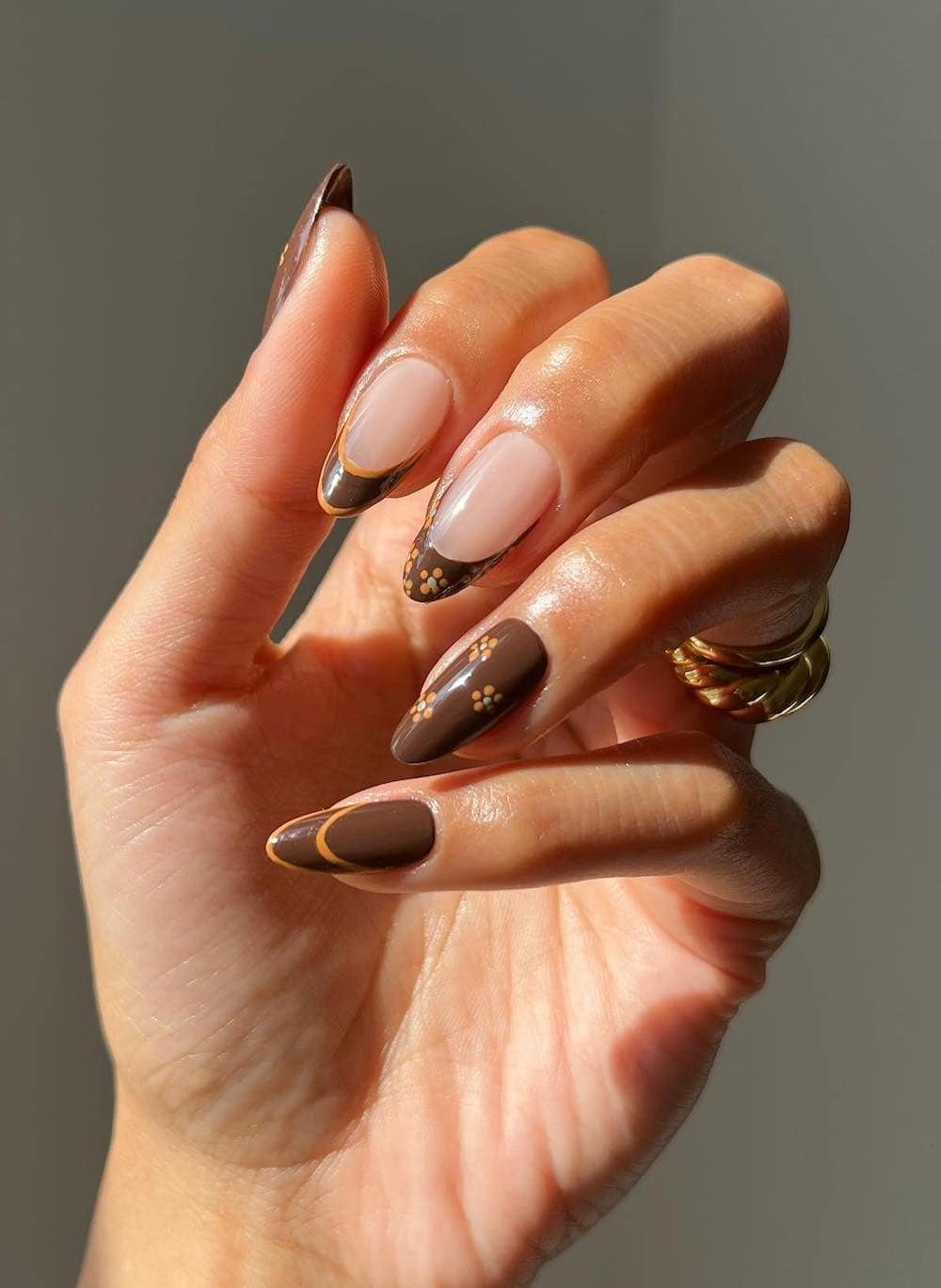 There’s nothing more timeless than a rich brown manicure, but this one comes with a golden twist. The chocolate tips are outlined with delicate amber-gold lines, creating a sleek, almost retro effect that feels quietly glamorous.