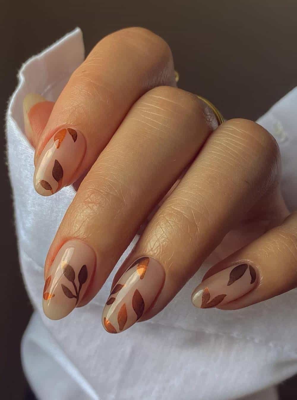 There’s a certain poetry in this design—the soft, milky nude base paired with delicate copper leaves feels like sunlight filtering through fall branches. Each metallic accent catches the light beautifully, like tiny flecks of autumn magic frozen in time.