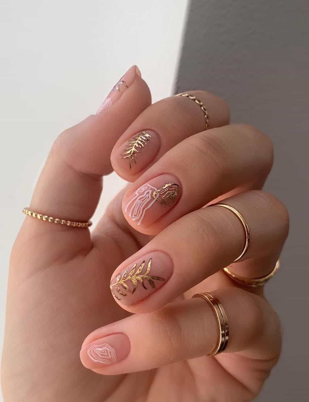 These nails are proof that minimalism can still be striking. A sheer nude base sets the stage for delicate gold leaf accents and subtle white line art, giving off an ethereal glow that feels effortlessly elevated.