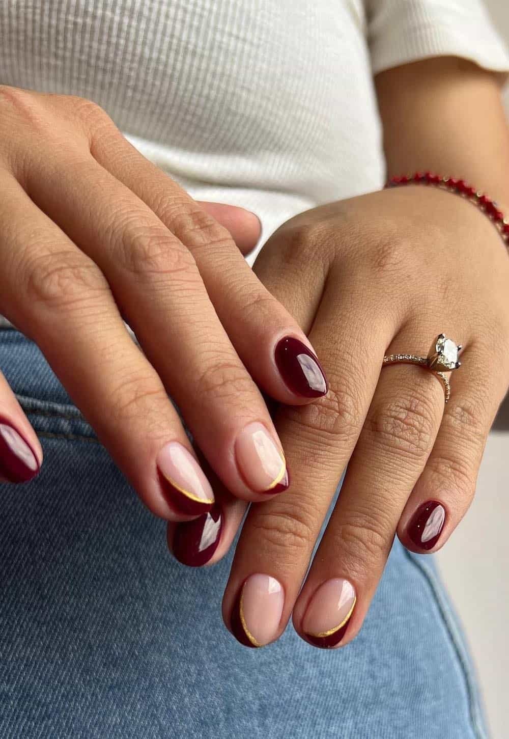 Deep wine tones paired with delicate gold edges—this is how you do glamour for fall. The contrast between the bold burgundy and the sliver of gold is so sophisticated, adding just enough shine to catch the candlelight at dinner.