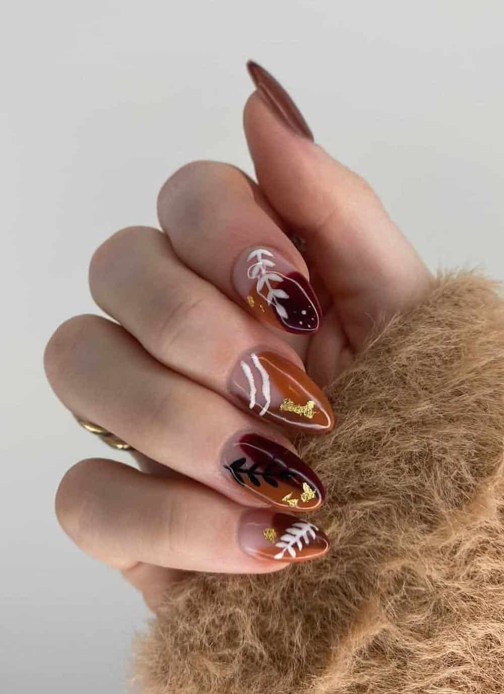A true autumn dream, this mani combines rust, amber, and burgundy tones with white and black botanical details. The layering of earthy colors and fine line art makes it feel inspired by falling leaves and cozy moments around the table.