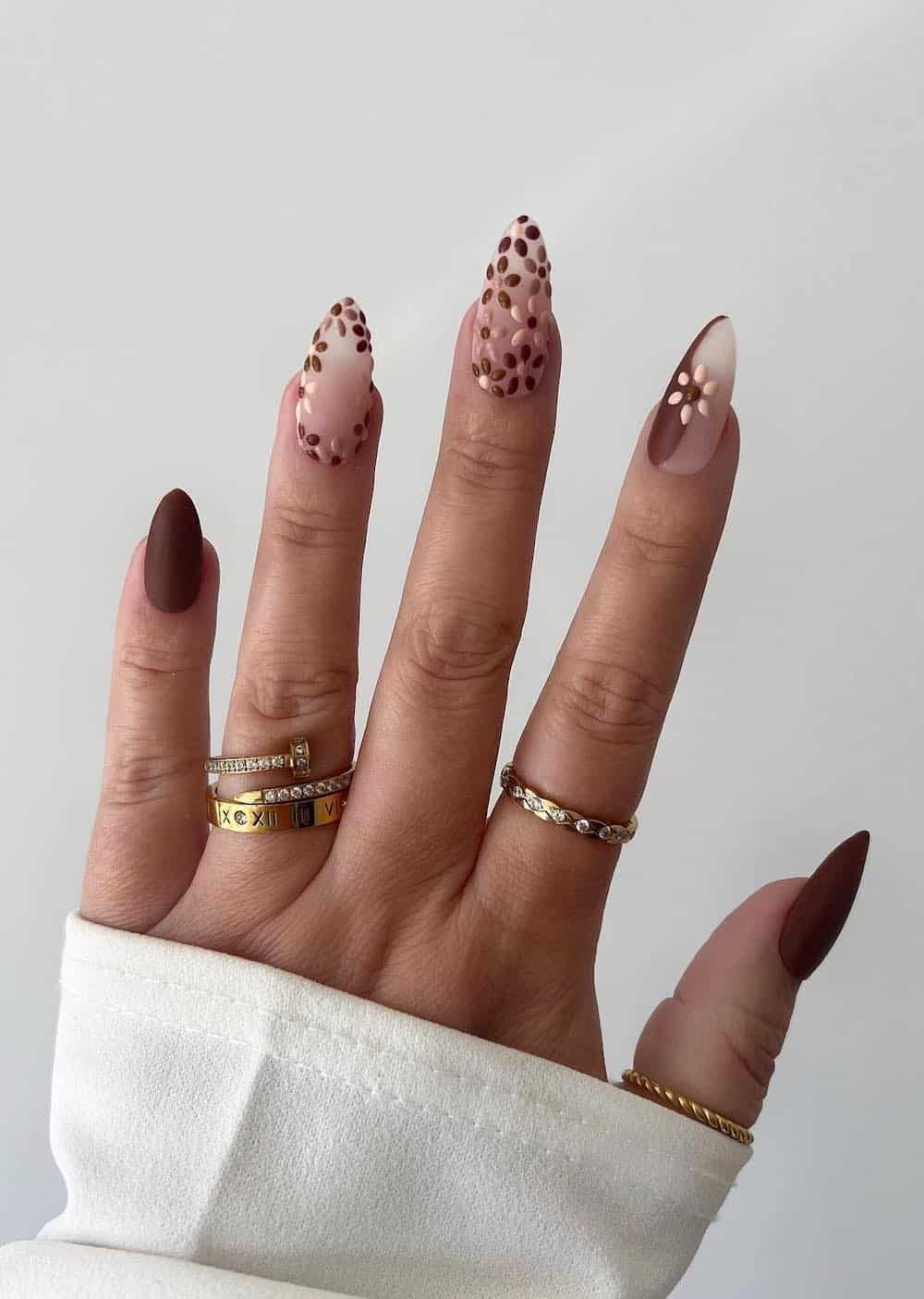 Each nail feels unique yet cohesive—the floral touches, the gradient tones—it’s like the designer version of hot cocoa in nail form. The almond shape enhances that elongated, elegant look without losing the charm of the design.