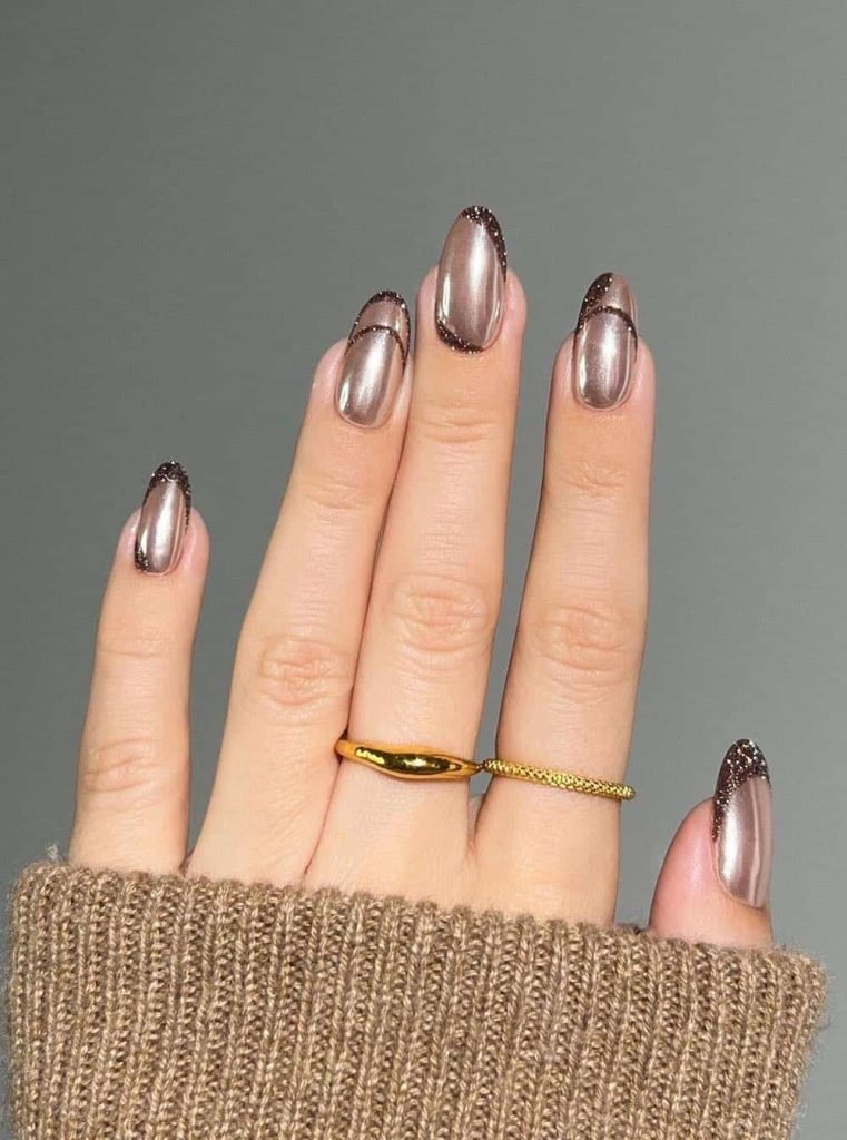 Shimmering bronze meets subtle chocolate in this metallic French tip moment. The glossy, mirror-like finish gives these nails a futuristic feel, while the warm undertones keep them grounded in fall. It’s edgy, but still soft enough for the holiday season.