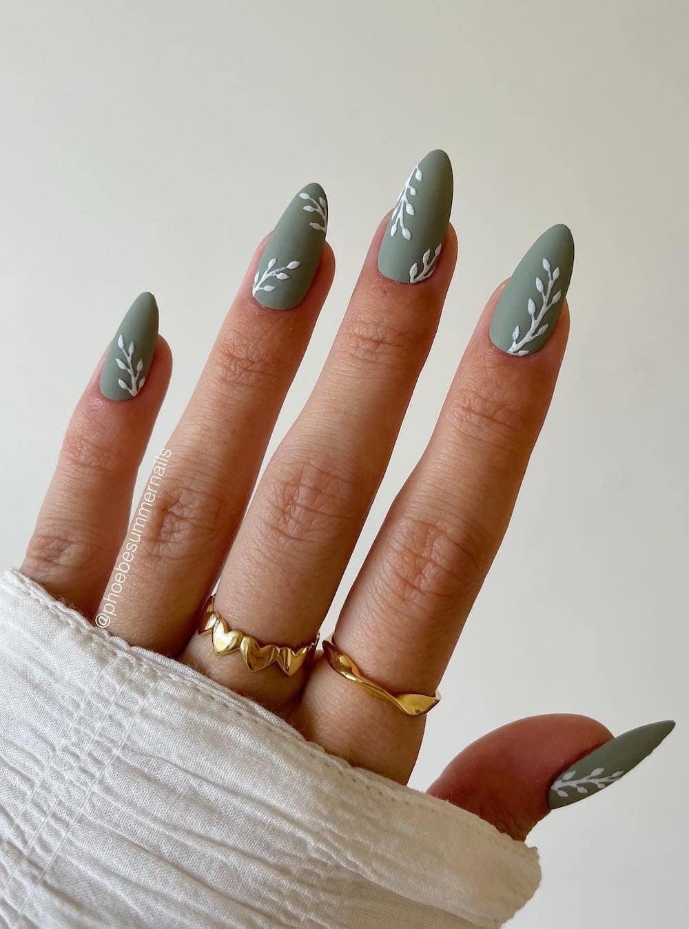 This muted sage-green mani feels fresh, calming, and utterly modern. The matte finish paired with delicate white leafy designs creates a soft, organic feel—like nature’s own minimalist artwork.