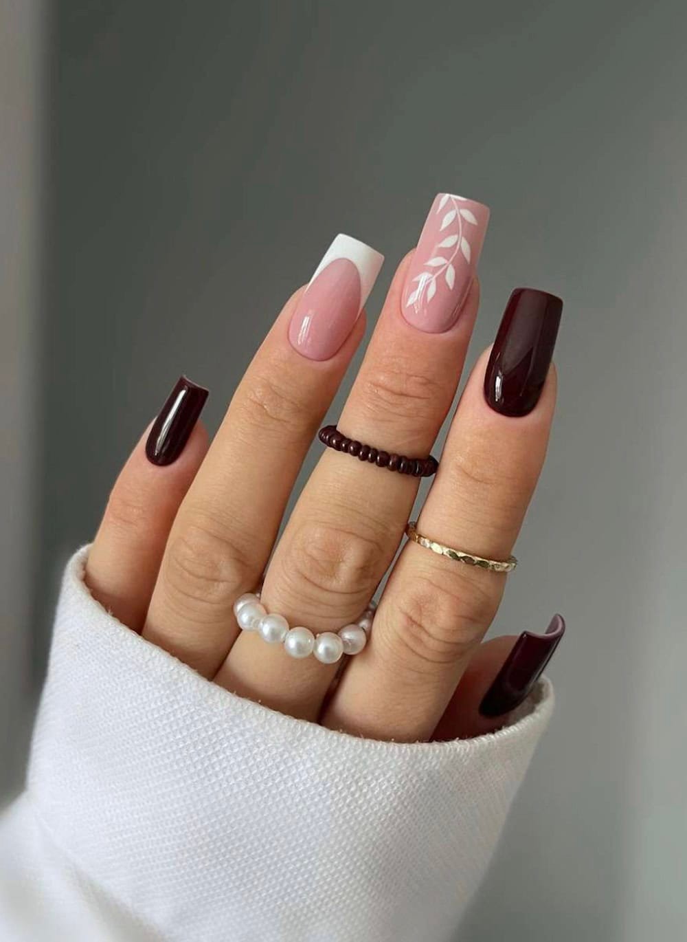 This mani takes the timeless French tip and gives it a sultry autumn twist. The deep plum shade feels rich and sophisticated, balanced by soft blush and crisp white detailing. Together, they create a striking contrast that’s both bold and romantic.