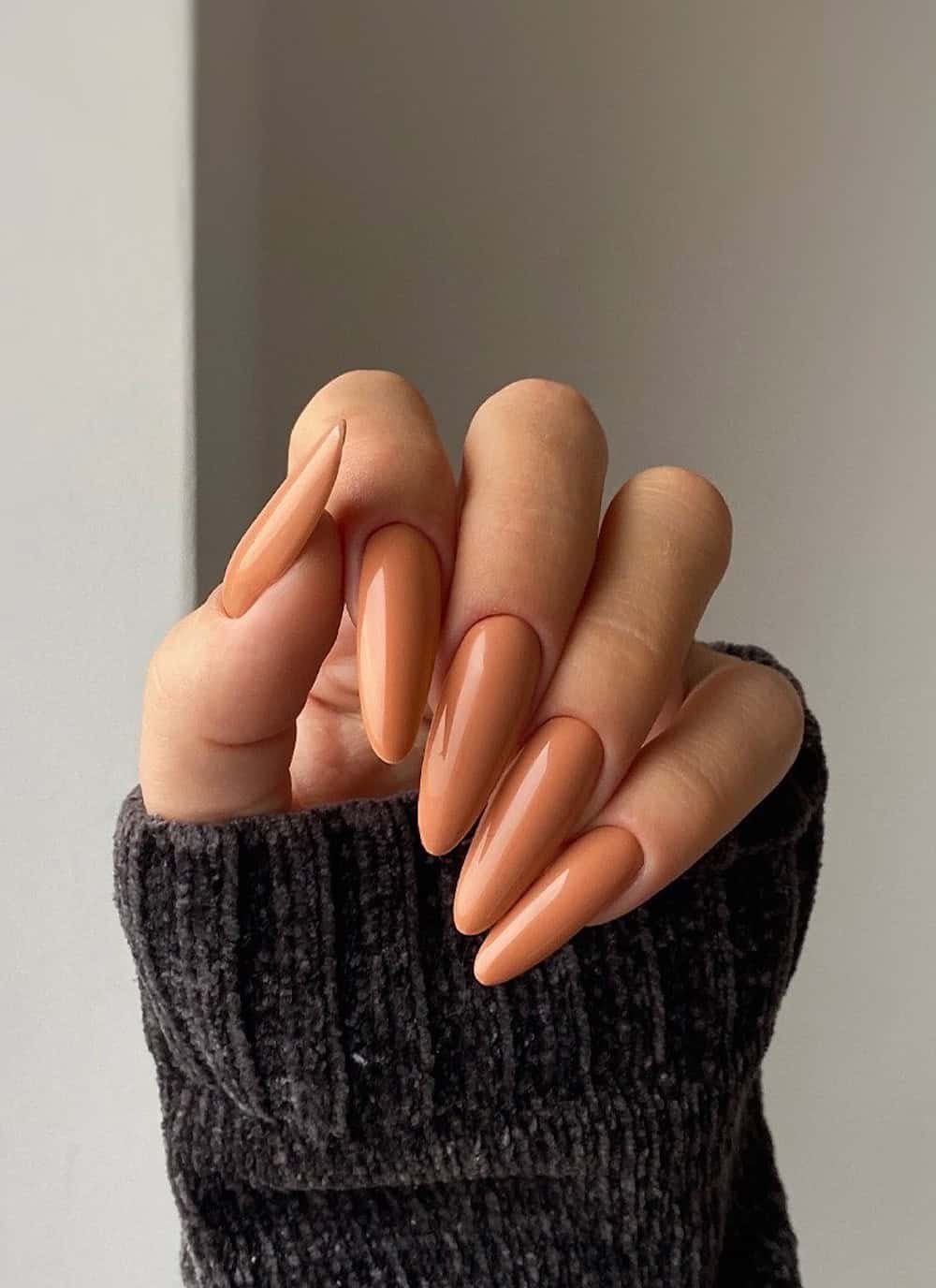 Rich, pumpkin-toned nails with a glossy, almond-shaped finish? Absolute perfection for Thanksgiving. The color sits beautifully between orange and caramel, giving off those golden-hour vibes that make fall so irresistible.