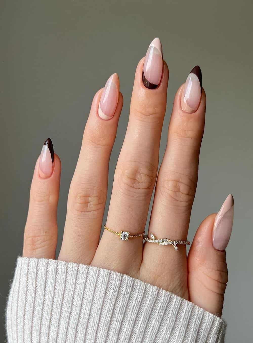 Meet the sleek, elevated French tip reimagined for autumn. The neutral pink base paired with curved brown edges feels fresh and fashion-forward. It’s giving “modern muse” with a hint of retro glam.