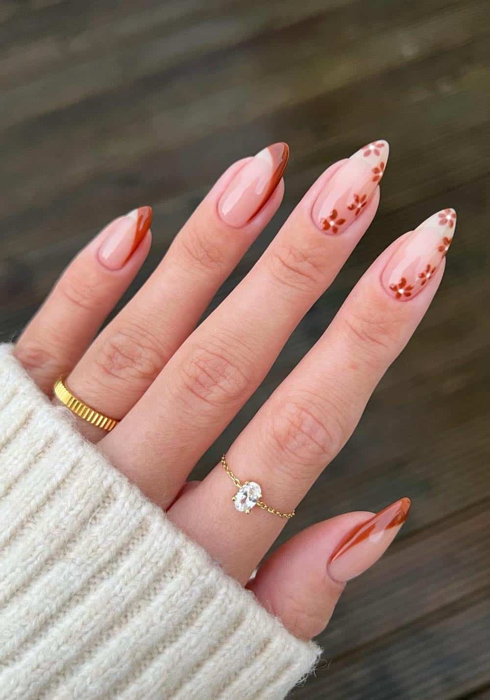 Florals for fall? Absolutely — when they look this good. These burnt orange petals scattered across almond tips are pure Thanksgiving elegance. The mix of warm tones and glossy finish feels seasonal without being cliché.
