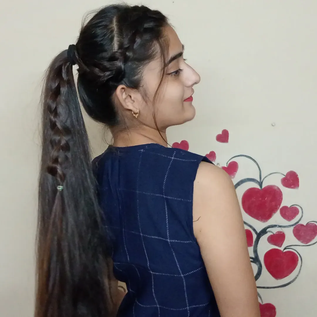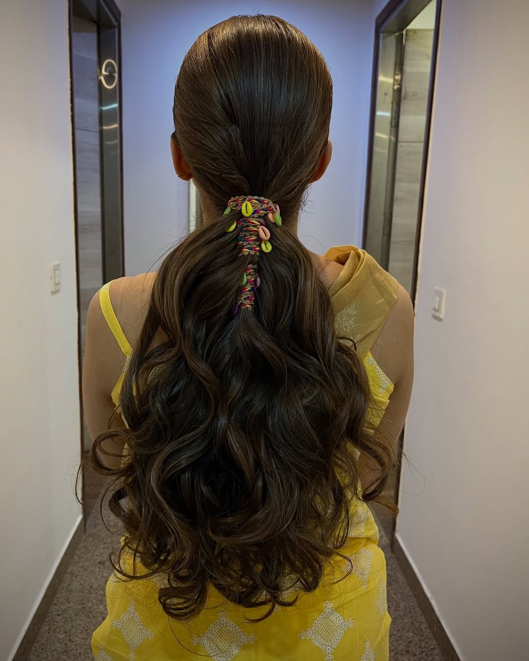 This ponytail is what happens when tradition meets play. With those perfectly defined waves and that colorful thread-and-shell wrap, it’s bringing desi glam without going full bridal. It’s modern, youthful, and honestly, just plain fun.