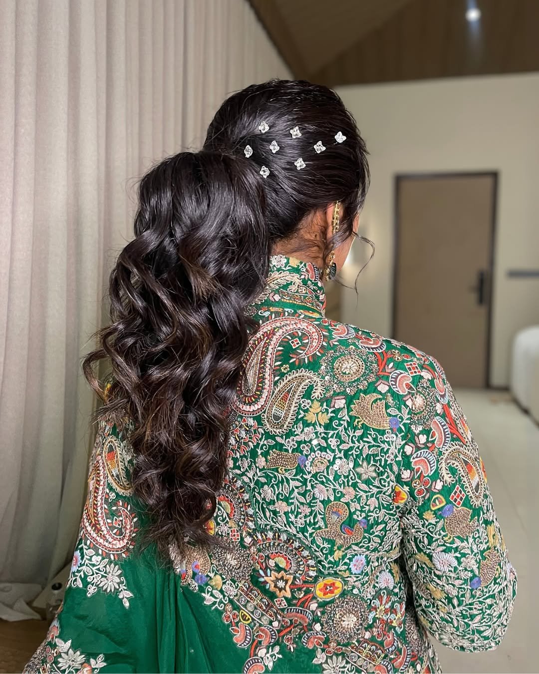 We love a voluminous pony with movement, and this one checks every box. That teased crown gives regal height, and the curls cascade like they’re dancing. But the real star? Those teeny diamond-like clips scattered through the crown—so subtle, yet so striking.
