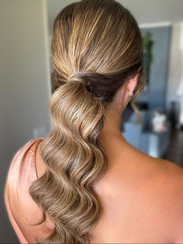 The shine. The wave. The control. @nataliawedding.bc gives us a golden hour glow in ponytail form. With a low-slung, hair-wrapped base and big Hollywood waves, this look belongs in a champagne ad—or at least your next formal event.