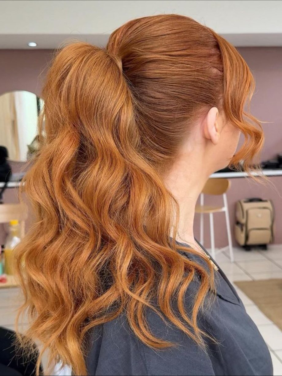 Big hair, bigger energy. This high ponytail on vibrant copper locks is giving fairytale with a side of sass. The volume at the crown? Just enough drama. The soft, tumbling waves? All class.