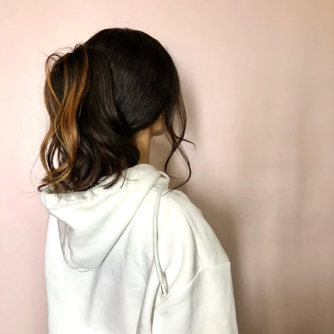 Proof that ponytails aren’t just for long hair. This shoulder-length, tousled pony with a hint of caramel streak says “cool girl energy” like nothing else. It’s messy, it’s soft, and it doesn’t care what anyone thinks.