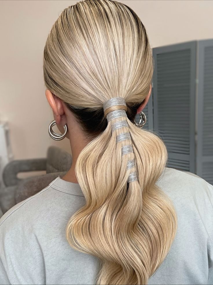 Wrapped and ready—but make it metallic. This ponytail takes “polished” to a whole new level. The icy blonde waves are already perfection, but that silver ribbon detailing wrapped down the base? Chef’s kiss. It’s like the hair equivalent of a designer clutch—elevated, intentional, and secretly saying “I’ve arrived.”