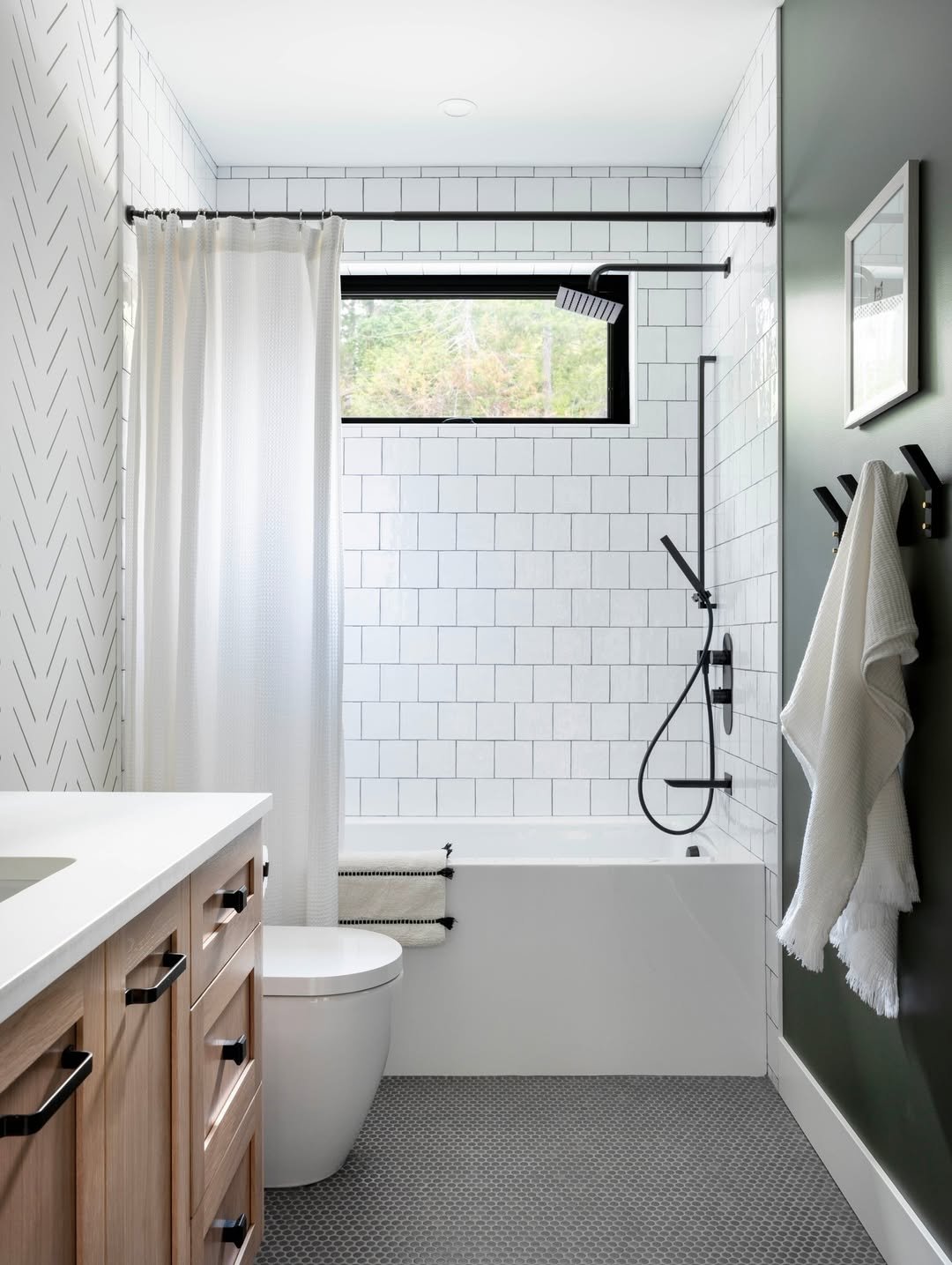This one hits that sweet spot between bold and balanced. The dark vanity grounds the whole space, while the patterned floor adds just enough movement to keep things from feeling flat. And that black-framed shower? Clean, sharp, and super intentional.
