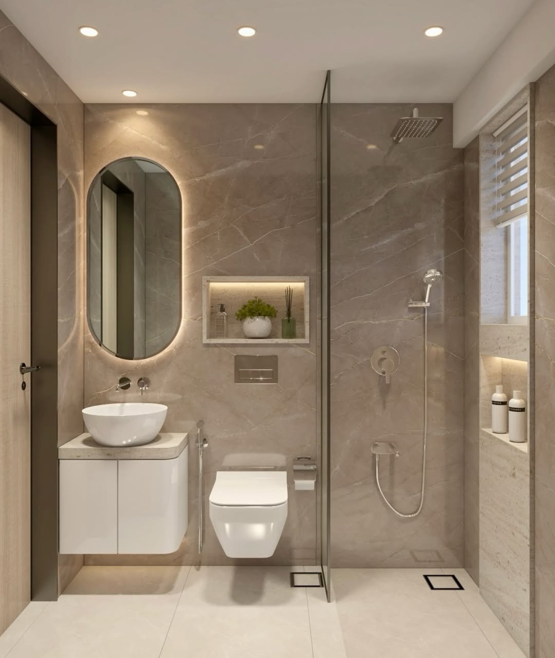 Now this is small-space design with intention. The floating vanity opens up the floor visually, while the built-in niches keep clutter off surfaces (and looking aesthetic while doing it). That soft backlighting around the mirror? Game changer.