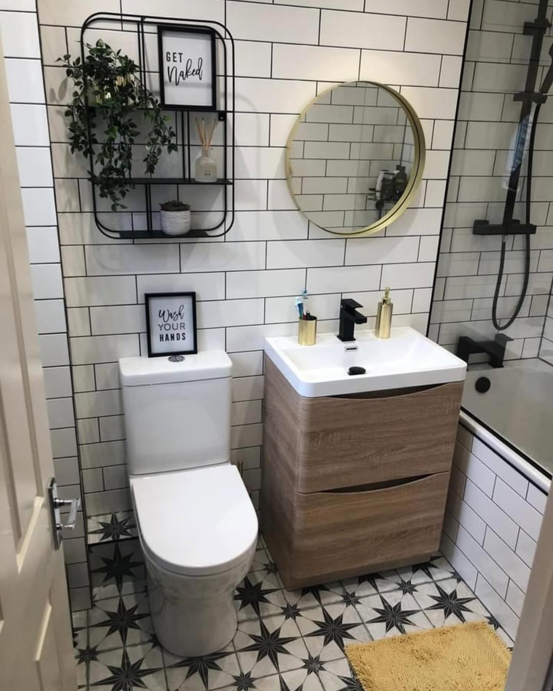 This bathroom mixes warmth and contrast in the best way. The wood vanity paired with white tiles and gold fixtures creates a look that’s both modern and inviting. And that round mirror? Always a win in tight spaces.