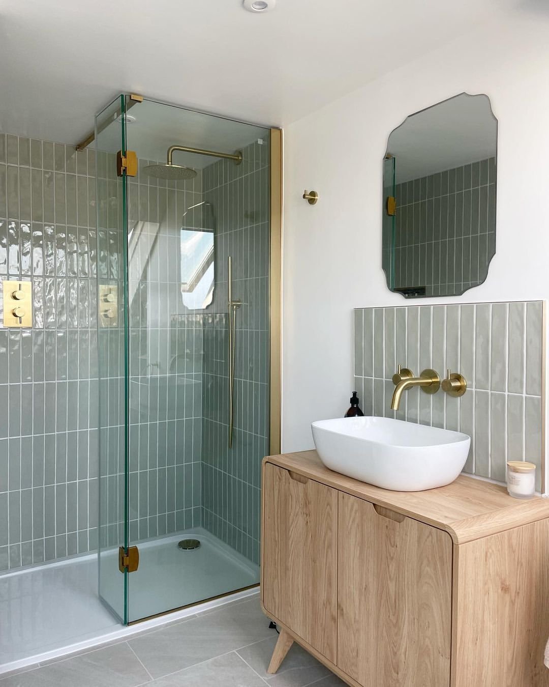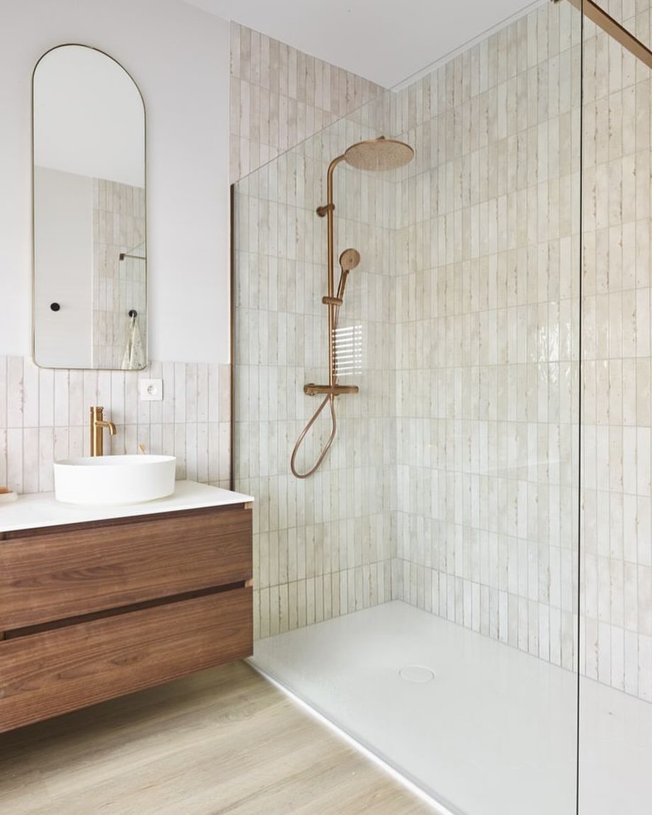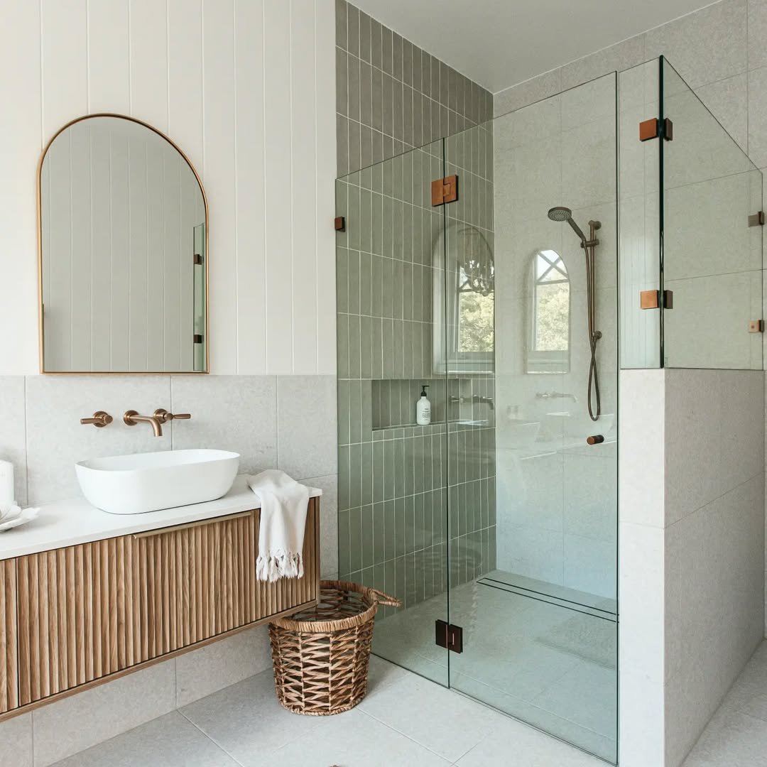 This one feels like a breath of fresh air. The soft sage vertical tiles paired with warm brass fixtures instantly give it that calm, slightly elevated vibe. And the glass shower enclosure keeps everything feeling open—no visual clutter, just clean lines doing their thing.