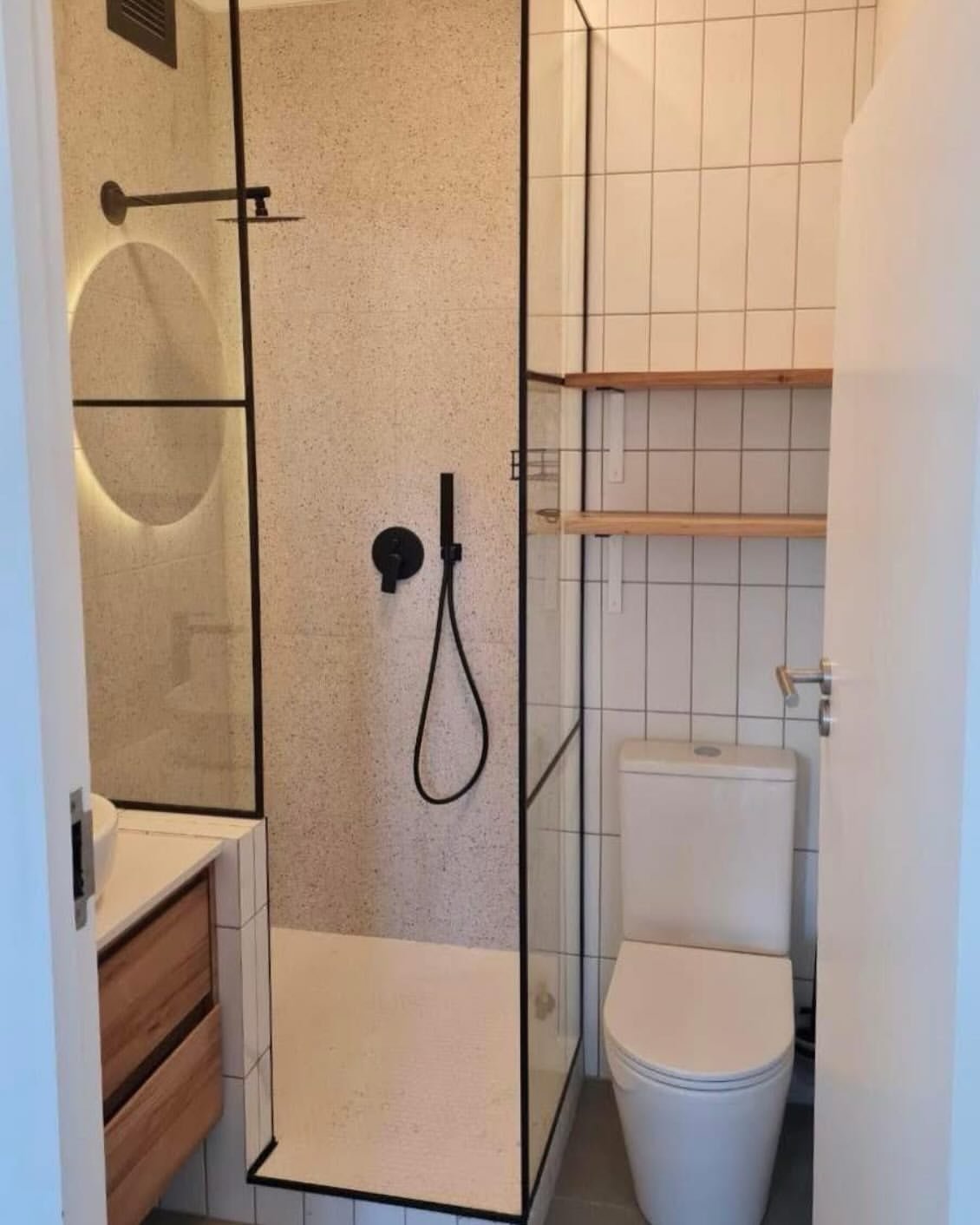 What really makes it work is the lighting—soft glow from the mirror paired with warm wood tones inside the shower. It’s a mix you don’t always expect, but somehow it clicks. Small space, big presence.