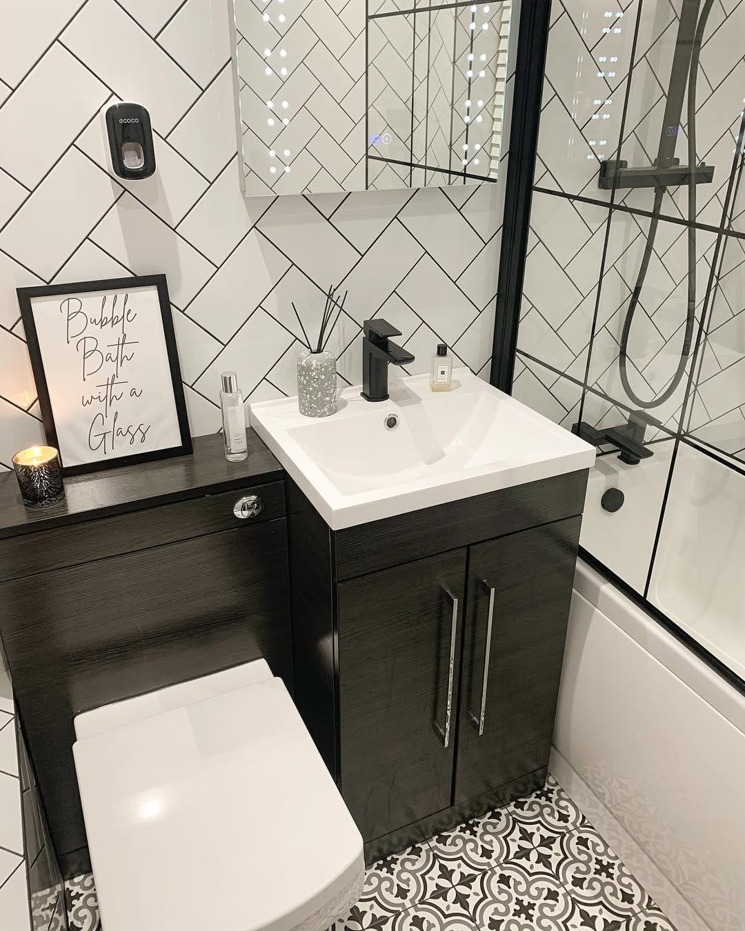 This one is all about sharp contrast done right. The black vanity against those crisp white herringbone tiles instantly elevates the space, while the patterned floor sneaks in just enough personality to keep things from feeling too clinical. And can we talk about how every inch is used? That compact sink and cabinet combo fits like it was custom-built for the spot.