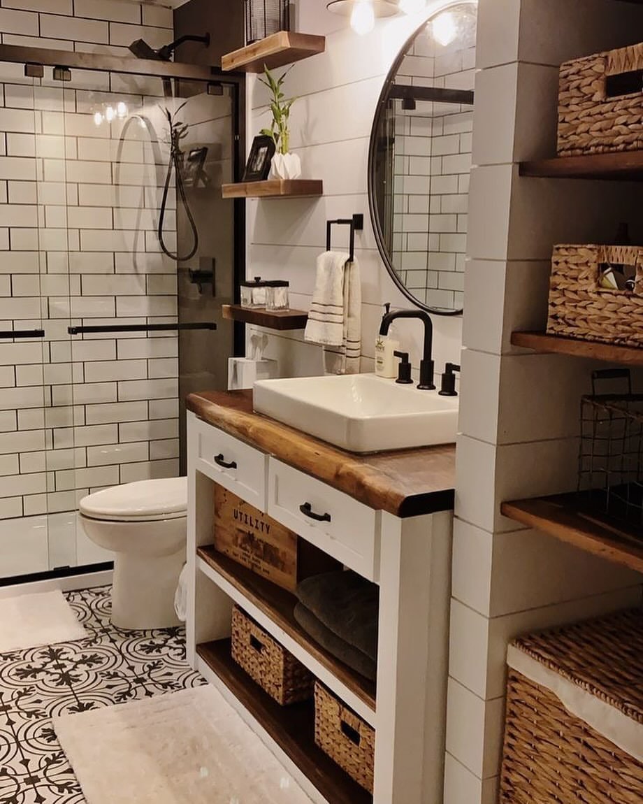 This bathroom brings in warmth through texture. The wood countertop, woven baskets, and open shelving add so much character without overwhelming the space. It feels cozy, functional, and a little bit farmhouse—but in a modern way.