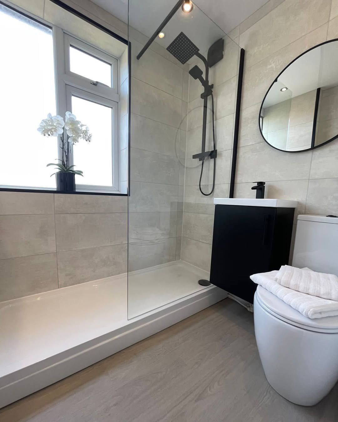 What really makes it work though is the cohesion. The black fixtures, framed mirror cabinet, and even the shower frame all echo each other so nothing feels random. It’s small, yes—but it feels intentional, styled, and honestly… kind of powerful for its size.