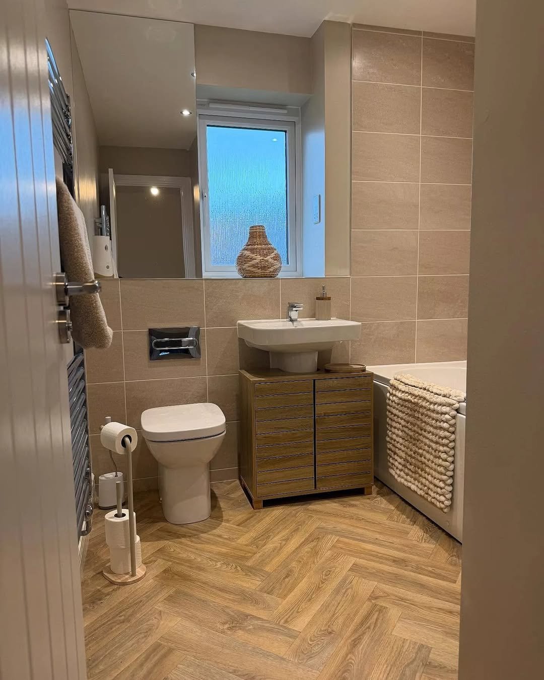 This bathroom leans into comfort in the best way. The soft beige tiles, wood-effect flooring, and cozy textures create a space that feels instantly welcoming. It’s not trying to be flashy—it’s just easy to live in.