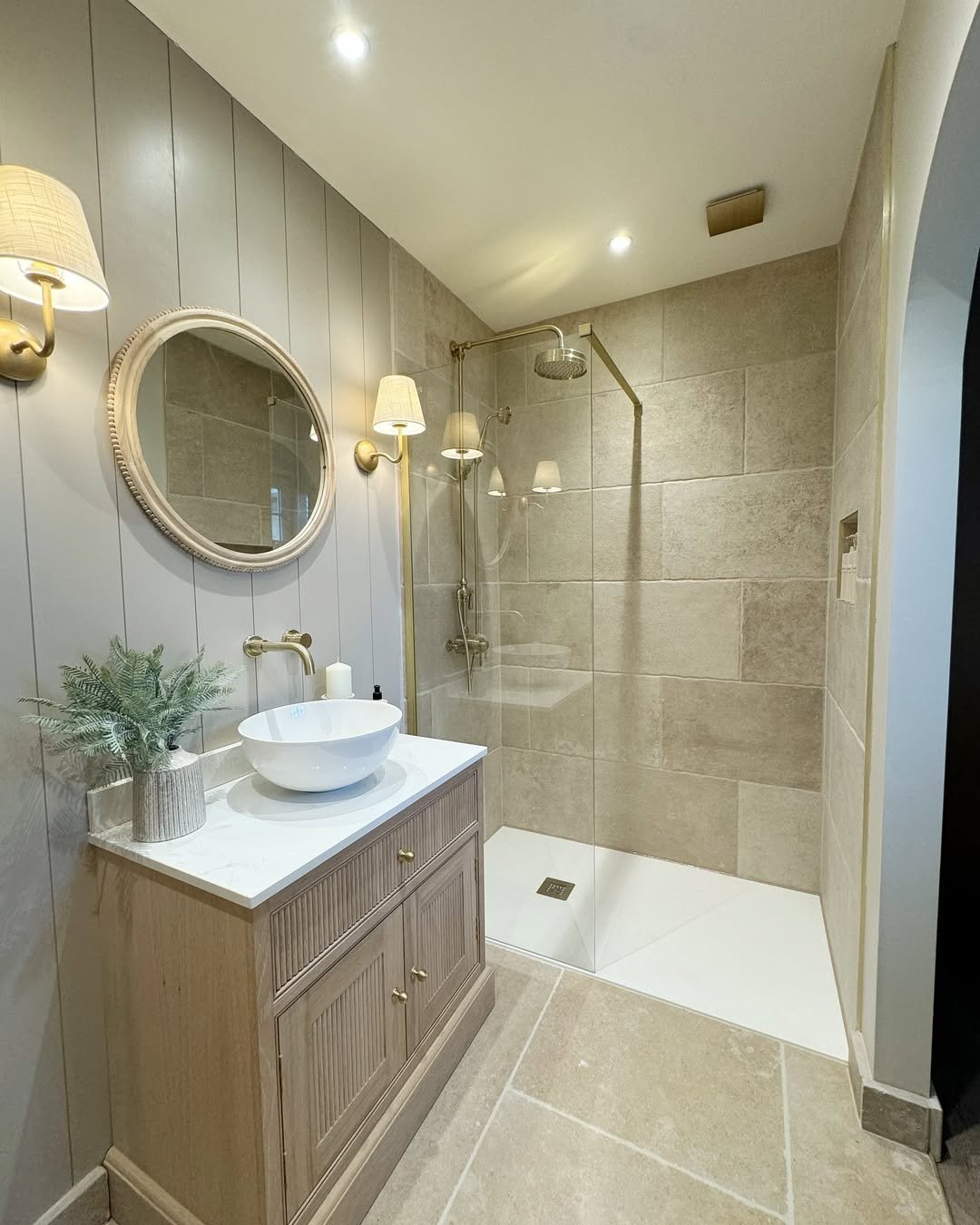 This one is all about quiet luxury. The fluted wood vanity, soft neutral palette, and brushed brass details come together in a way that feels calm but elevated. Nothing loud—just really, really well done.
