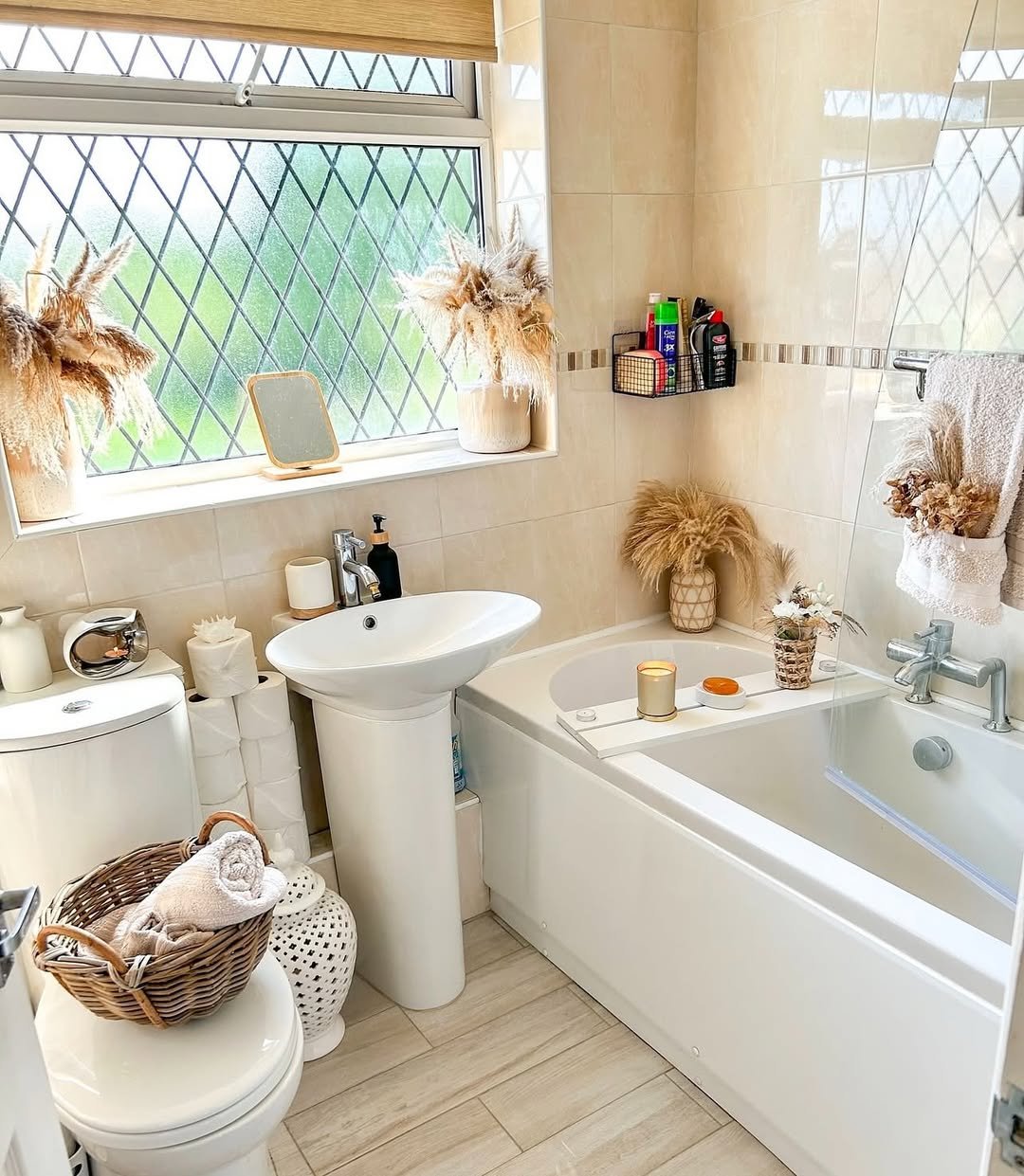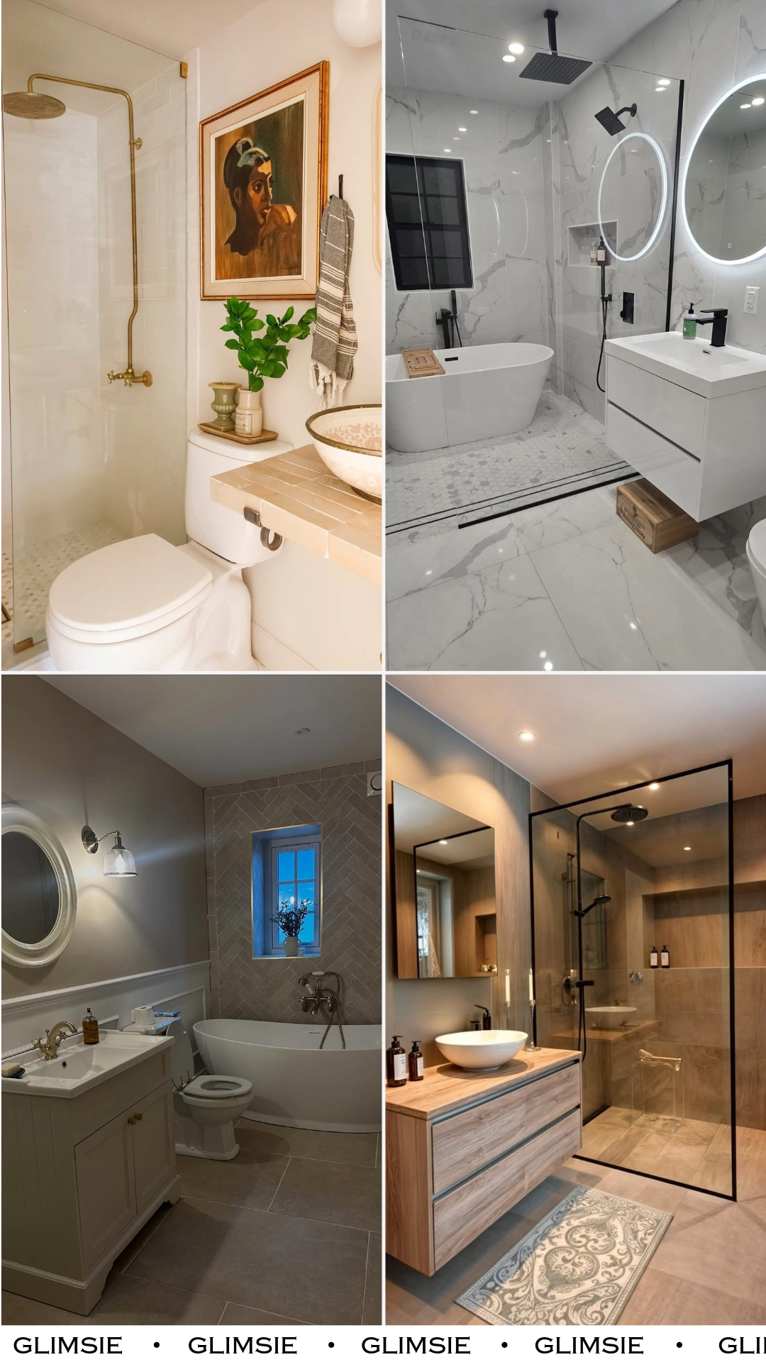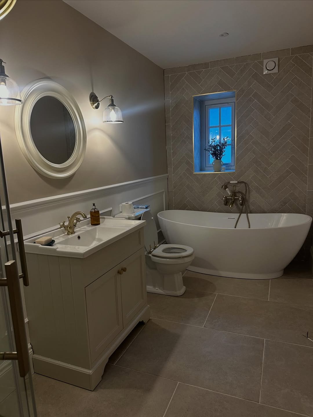 This one leans into charm, and it works. Soft lighting, warm neutrals, and that freestanding tub give it a relaxed, countryside vibe that feels instantly calming.