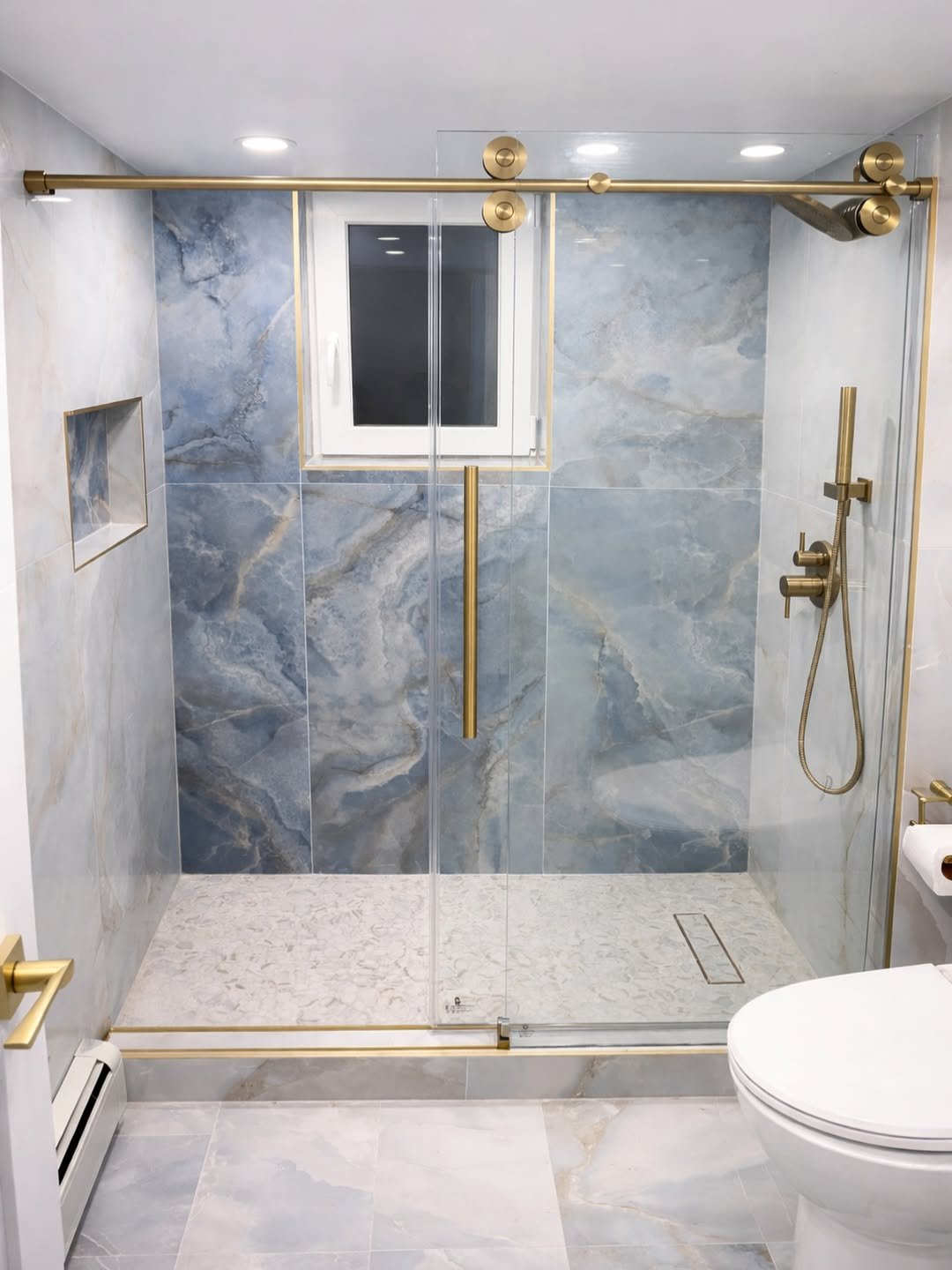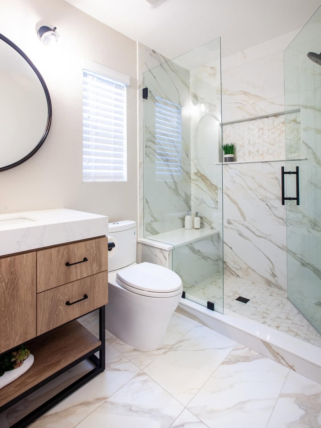 This one is all about letting materials do the talking. The soft marble veining flows from floor to shower, creating that seamless, expanded look every small bathroom needs.
